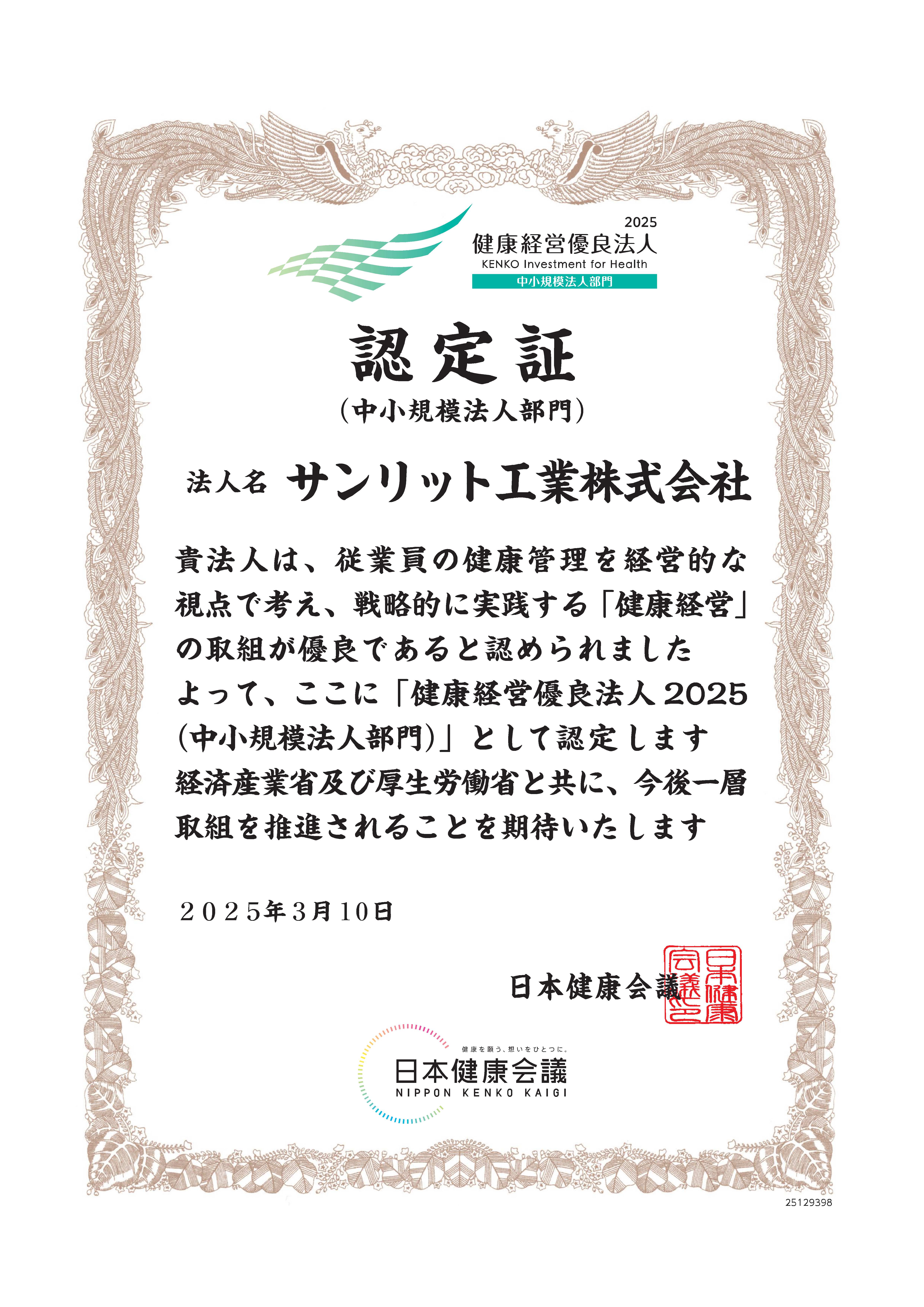 サンリット工業株式会社は、2025年3月10日に、経済産業省と日本健康会議が主催する健康経営優良法人認定制度にて、に認定されました。