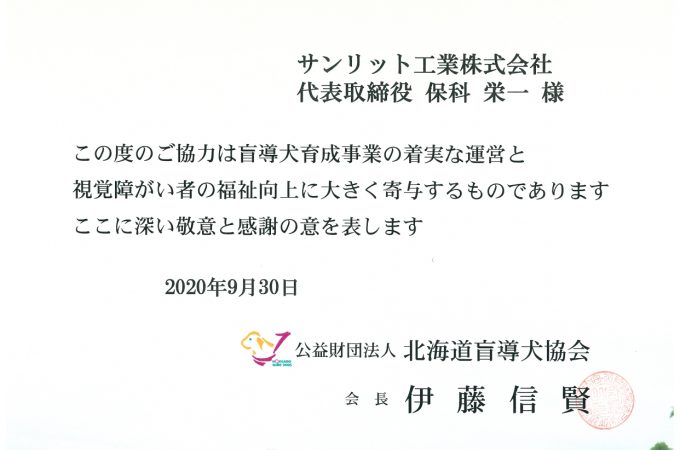 2020年9月30日 公益財団法人 北海道盲導犬協会より感謝状をいただきました。 弊社は社会貢献活動の一環として、盲導犬の普及活動を支援しております。