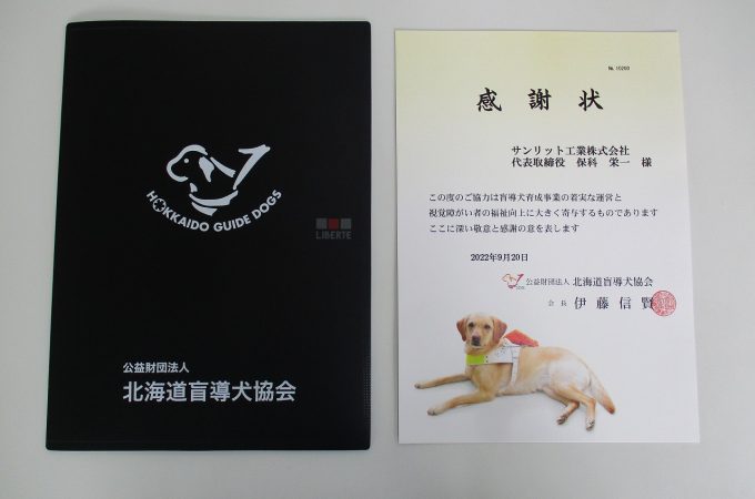 2022年9月20日 公益財団法人 北海道盲導犬協会より感謝状をいただきました。 弊社は社会貢献活動の一環として、盲導犬の普及活動を支援しております。